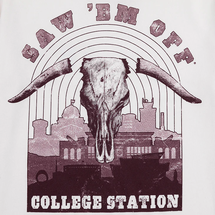 Show off your Aggie pride with our Saw 'Em Off Skyline t-shirt! Featuring a white background with a maroon Saw 'Em Off logo on the left chest and a bold version on the back against the College Station skyline, this shirt is perfect for any true fan. Represent your team in style and stand out from the crowd!