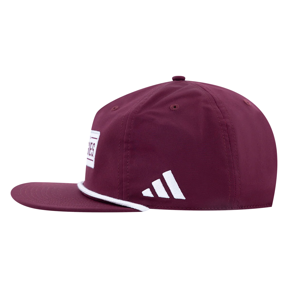 Stand out in the crowd with this bold maroon flat brim hat featuring a striking white patch emblazoned with "Texas A&M University Gig 'Em Aggies" in maroon lettering. The distinctive white rope accent adds a touch of classic collegiate style to this Adidas cap. Perfect for game days, tailgates, or everyday campus wear, this premium headwear lets you showcase your Aggie pride with confidence and flair. Gig 'Em in style!