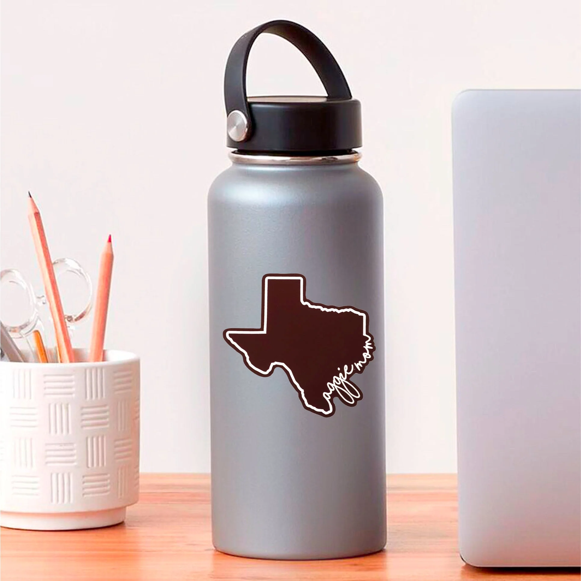 This sticker is perfect for any Fightin' Texas Aggie Mom! The sticker is a Maroon Texas with a cursive "aggie mom" making up the eastern border. This sticker will go great on any laptop, bottle, or anything else!